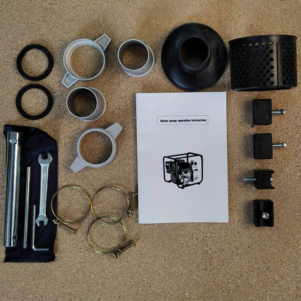 Комплектація мотопомпи. У комплект входить мінімальний набір інструменту, хомути, фланці (на які встановлюються рукави) та фільтр на всмоктувальний рукав.