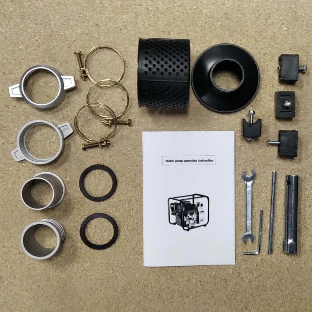 Комплектація мотопомпи. У комплект входить мінімальний набір інструменту, хомути, фланці (на які встановлюються рукави) та фільтр на всмоктувальний рукав.